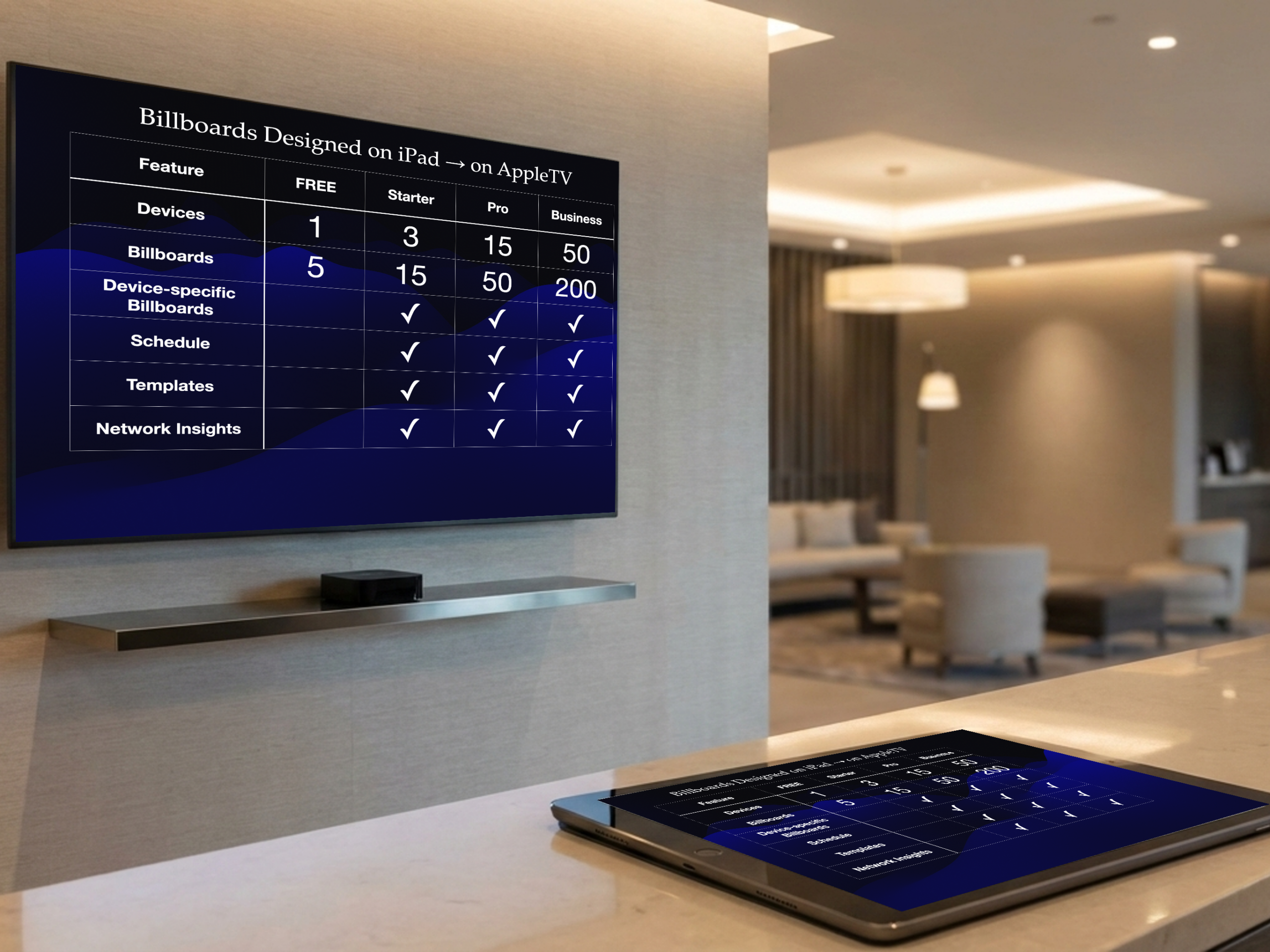 Create stunning billboards on iPad. Display them beautifully on Apple TV. Perfect for limo drivers, restaurants, retail stores, offices, and events.